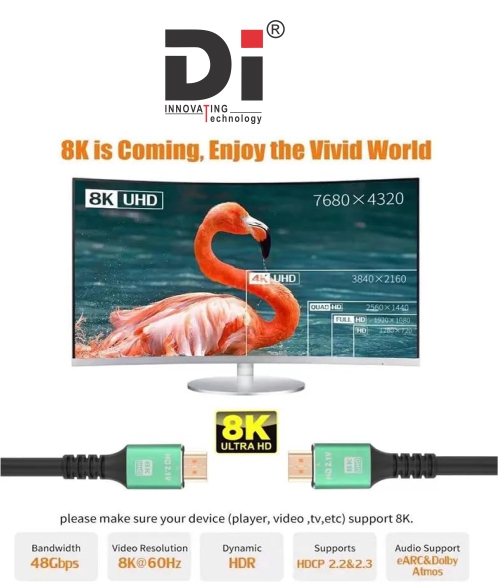 Full HDMI 2.1 / Ultra High Speed certification — Ensure the cable supports 48 Gbps, 8K@60Hz, 4K@120Hz, HDR, HDCP 2.2/2.3, eARC etc. Passive or non-certified cables may claim 8K but underperform in real use.